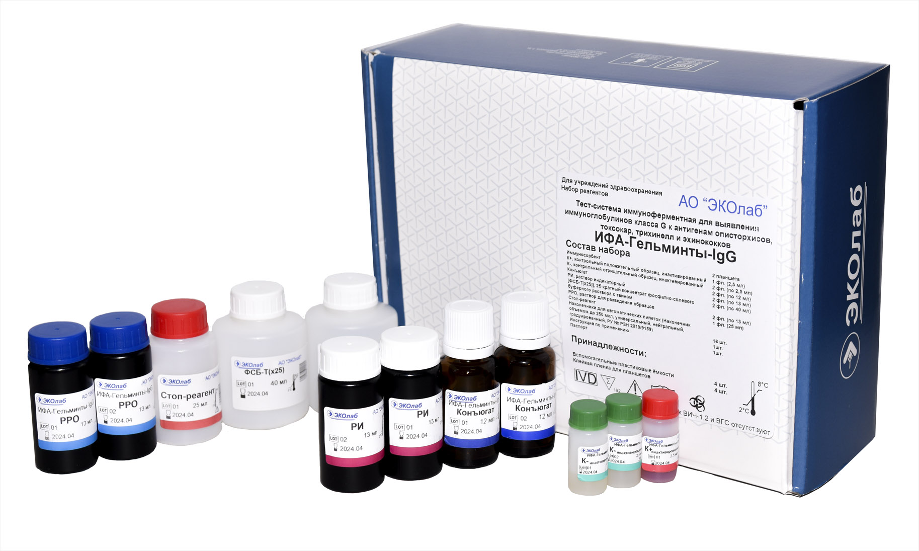 Тесты ЭкоЛаб отличаются высокой точностью и позволяют быстро выявить наличие антител в крови. Реагенты герметично упакованы в коробочки. Большая часть представлена в жидкой или сыпучей формах. Иммунологические исследования проводятся строго в соответствии с техникой безопасности и требуют особой осторожности от лаборанта. В коробке имеется всё необходимое для проведения тестирования.