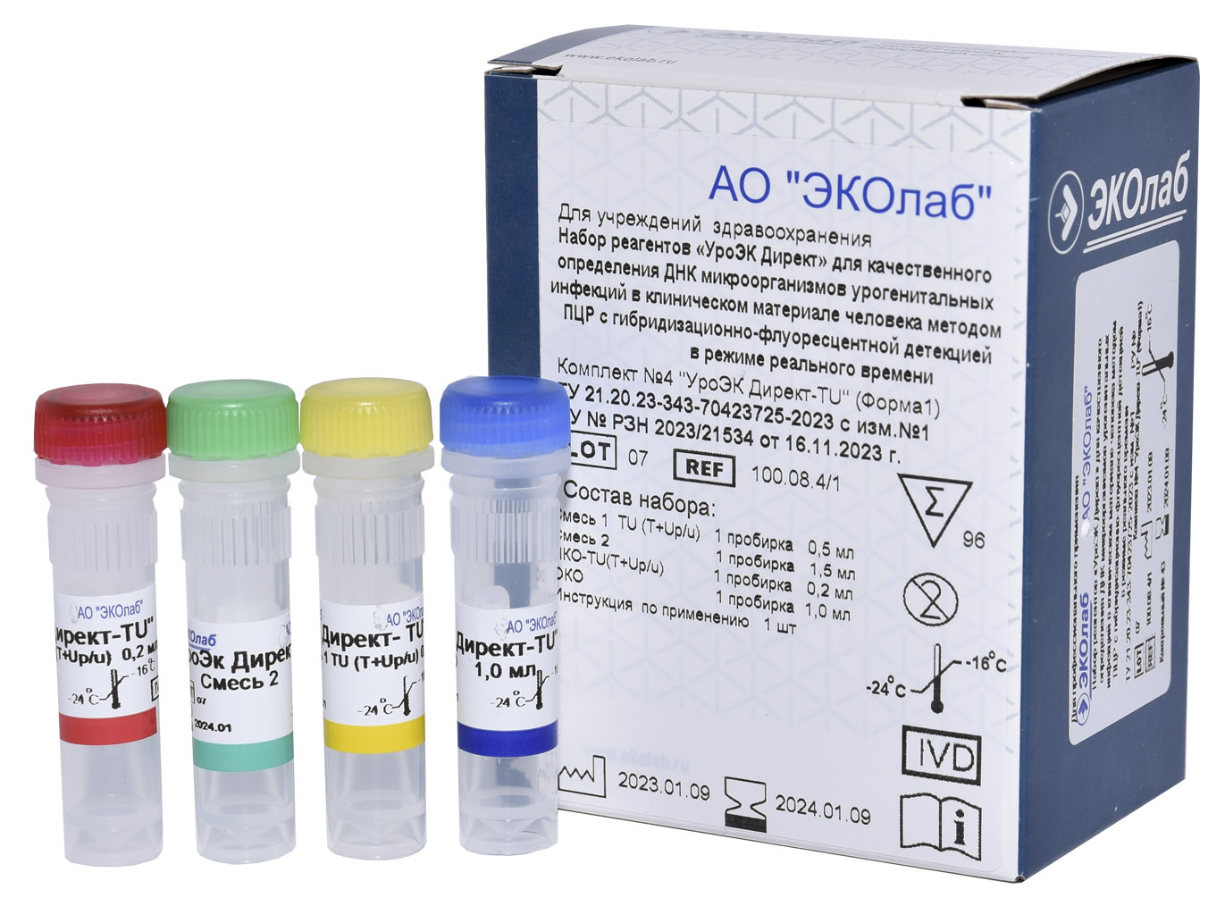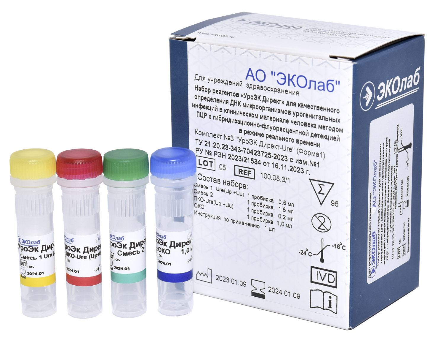 Набор реагентов «УроЭК Директ-Ure» для качественного определения ДНК урогенитальных уреаплазм (Ureaplasma parvum, Ureaplasma urealyticum) в клиническом материале человека методом ПЦР с гибридизационно-флуоресцентной детекцией в режиме реального времени.