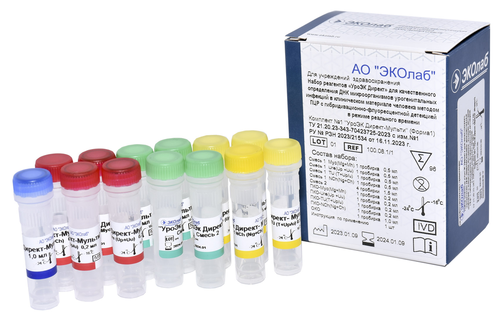 Набор реагентов «УроЭК Директ-Мульти» для качественного определения ДНК микроорганизмов урогенитальных инфекций (Mycoplasma genitalium, Mycoplasma hominis, Ureaplasma parvum, Ureaplasma urealyticum, Trichomonas vaginalis, Neisseria gonorrhoeae, Chlamydia trachomatis) в клиническом материале человека методом ПЦР с гибридизационно-флуоресцентной детекцией в режиме реального времени.