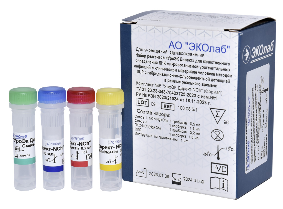Набор реагентов «УроЭК Директ-NCh» для качественного определения ДНК возбудителя гонореи и урогенитального хламидиоза (Neisseria gonorrhoeae, Chlamydia trachomatis) в клиническом материале человека методом ПЦР с гибридизационно-флуоресцентной детекцией в режиме реального времени.