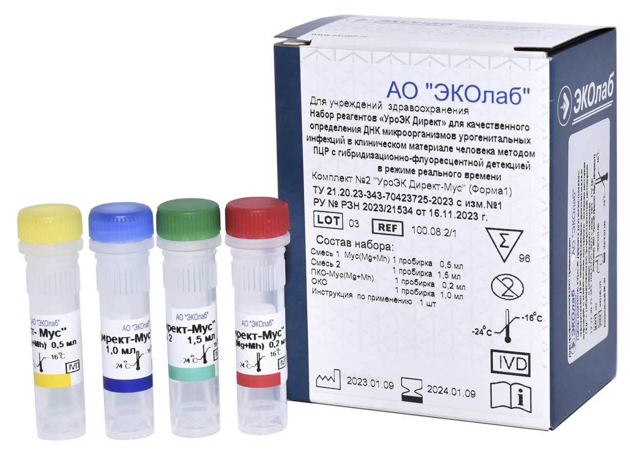 Набор реагентов «УроЭК Директ-Myc» для качественного определения ДНК урогенитальных микоплазм (Mycoplasma genitalium, Mycoplasma hominis) в клиническом материале человека методом ПЦР с гибридизационно-флуоресцентной детекцией в режиме реального времени.