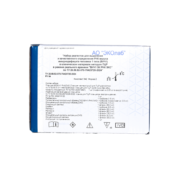 Набор реагентов для выделения и качественного определения РНК вируса иммунодефицита человека 1 типа (ВИЧ1) в клиническом материале методом ПЦР в режиме реального времени «ВИЧ1 ЭК РНК ЭКС» по ТУ 20.59.52-370-70423725-2024» (далее по тексту - «набор реагентов «ВИЧ1 ЭК РНК ЭКС» или «набор реагентов») предназначен для выделения и качественного определения РНК ВИЧ1 в образцах плазмы (с К3ЭДТА) и сыворотке крови человека методом полимеразной цепной реакции (ПЦР) с гибридизационно-флуоресцентной детекцией. Материалом для проведения ОТ-ПЦР/ПЦР служат пробы РНК, экстрагированные из исследуемого материала.
