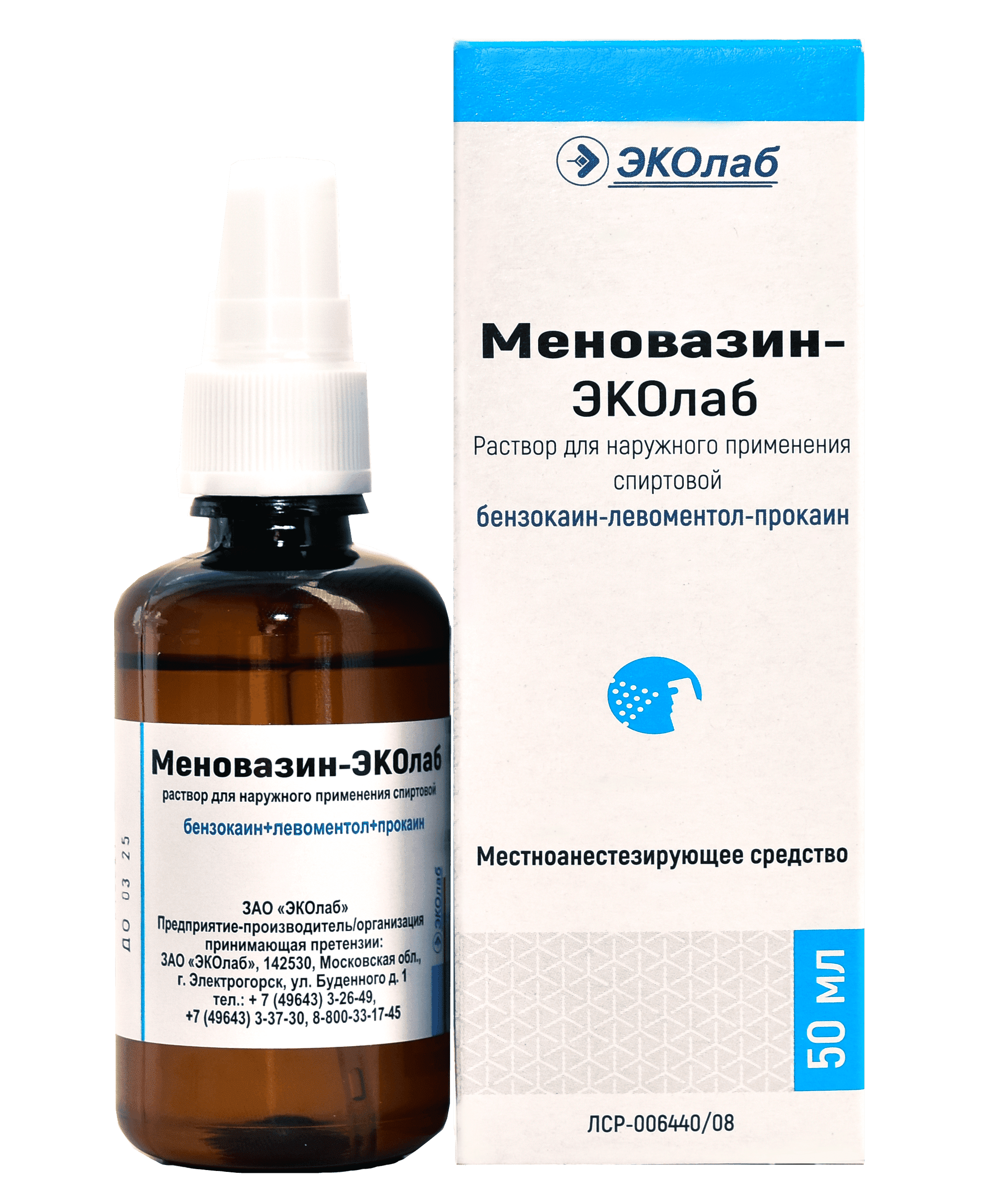- • Меновазин ЭкоЛаб. Средство показано к применению при зудящих дерматозах, невралгии, артралгии и миалгии. Предназначено для наружного применения путём растирания им болезненных участков, длительность курса составляет 3–4 недели с возможностью повторения. В основе препарата три действующих вещества анестезирующего действия, растворенных в 70% этаноле.