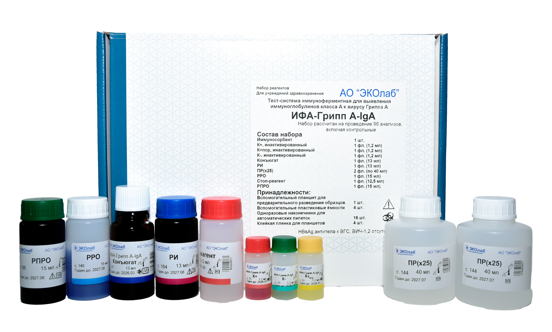 Тесты ЭкоЛаб отличаются высокой точностью и позволяют быстро выявить наличие антител в крови. Реагенты герметично упакованы в коробочки. Большая часть представлена в жидкой или сыпучей формах. Иммунологические исследования проводятся строго в соответствии с техникой безопасности и требуют особой осторожности от лаборанта. В коробке имеется всё необходимое для проведения тестирования.